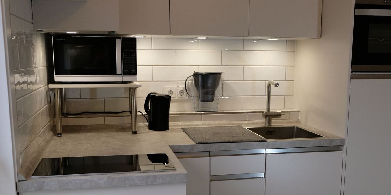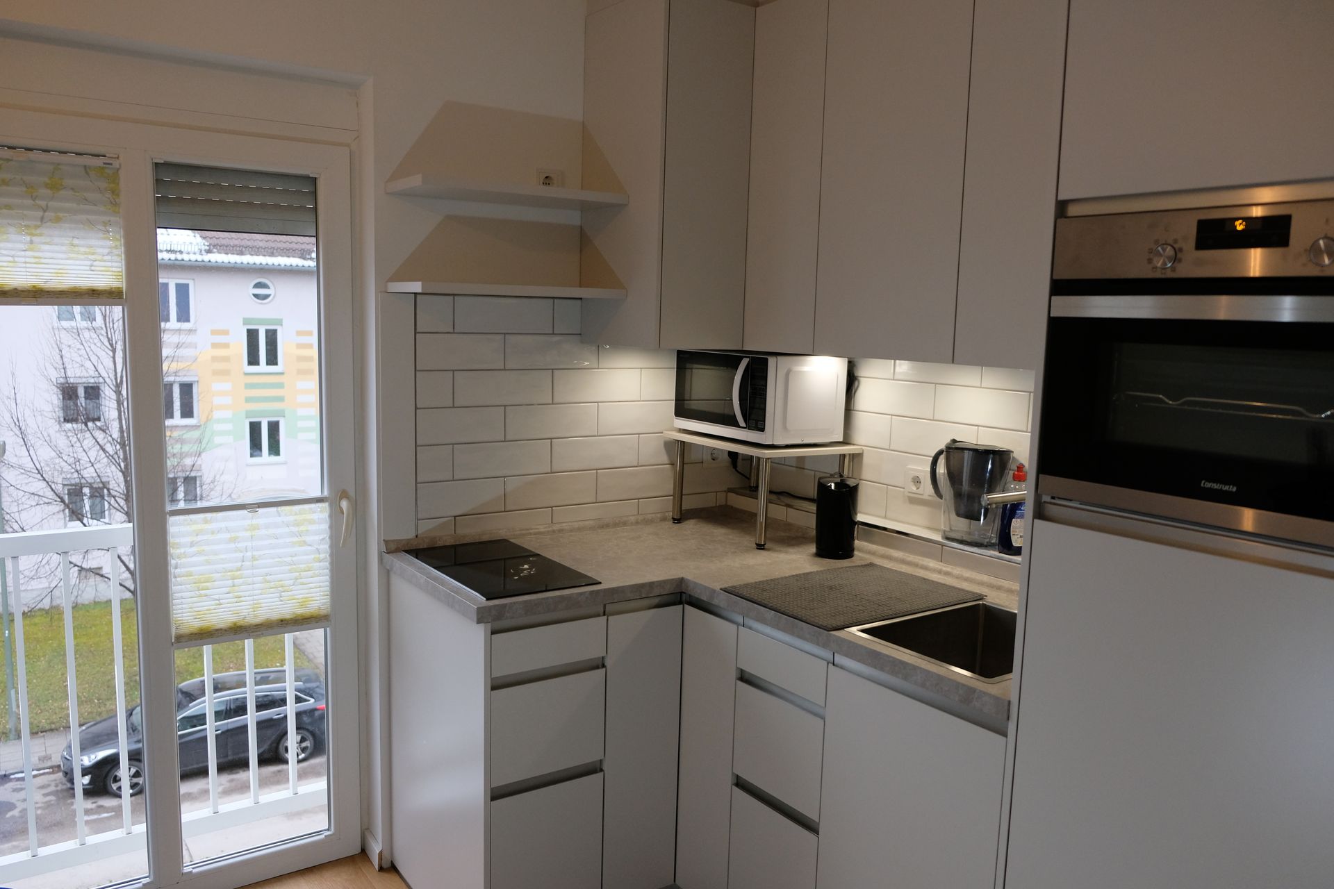 Die hochwertige und neue Einbauküche von einem Münchner Küchenstudio passt sich ideal in den Küchenbereich ein.